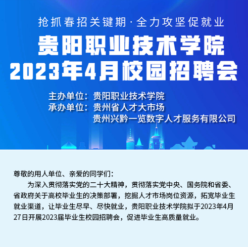 近二十年時(shí)間里,貴州省人才大市場主辦的校園招聘會(huì)涵蓋了貴州省內(nèi)各大高校,包括貴州大學(xué)、貴州師范大學(xué)、貴州財(cái)經(jīng)大學(xué)、貴陽學(xué)院、貴陽中醫(yī)學(xué)院、貴州職業(yè)技術(shù)學(xué)院等。每年根據(jù)高校畢業(yè)生的就業(yè)特點(diǎn)開展十多場專場校園招聘會(huì),組織上千家單位提供上萬個(gè)招聘職位。每場校園招聘活動(dòng),貴州省人才大市場都精心組織,根據(jù)學(xué)校自身的特色專業(yè)挑選出百余家需求專業(yè)契合的單位進(jìn)入校園,并與高校緊密合作進(jìn)行宣傳和組織,大大提高了求職成功率,每年達(dá)成錄用意向數(shù)千人。招聘活動(dòng)期間,還向?qū)W生宣傳最新的就業(yè)創(chuàng)業(yè)政策,以實(shí)際行動(dòng)踐行著“以人為本,服務(wù)社會(huì)”的宗旨,營造積極就業(yè)的良好社會(huì)氛圍。